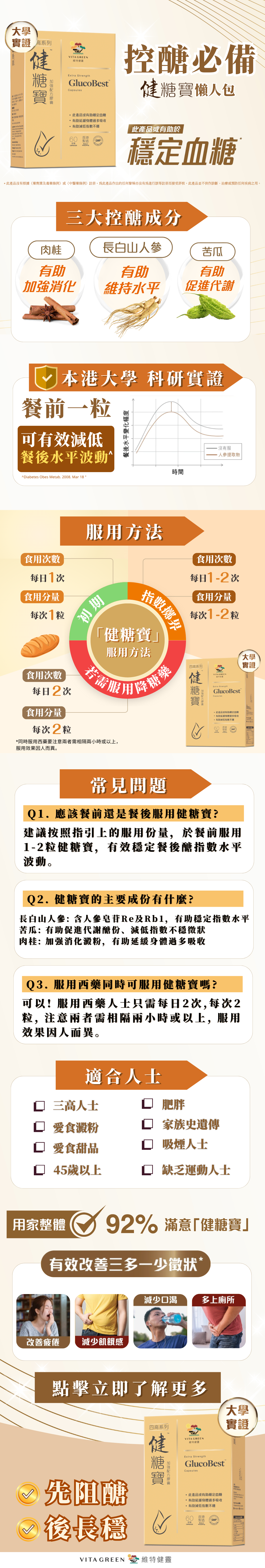 維特健靈「甙醣仁參」乃採用有神草之稱的特級長白山人參提煉而成,蘊含豐富活性成分人參皂甙及人參多醣,經大學臨床研究証明適合關注血糖人士,調理身體機能。