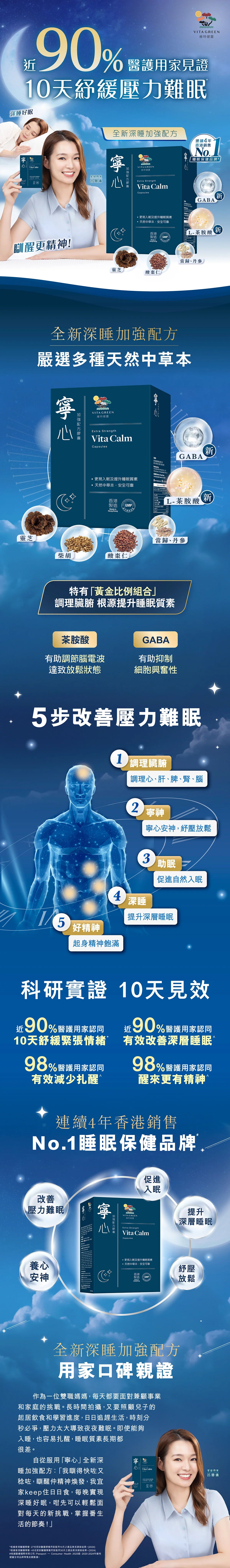 - 全新加強配方加入「黃金比例組合」天然成分GABA和茶胺酸